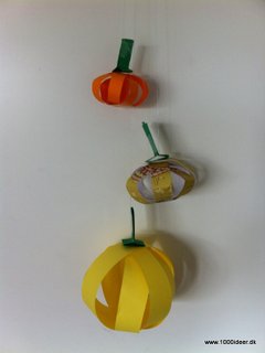 Disse græskar har Lea lavet ud af strimler, som hun har klippet ud af kraftigt ensfarvet papir og mønsteret papir. Lav 4 strimler i samme længde. Saml hver stri
